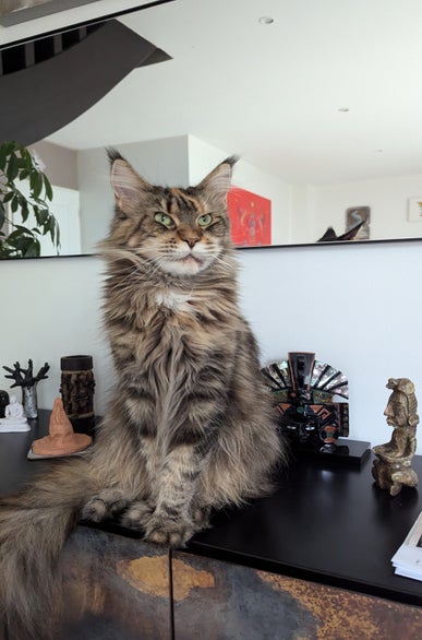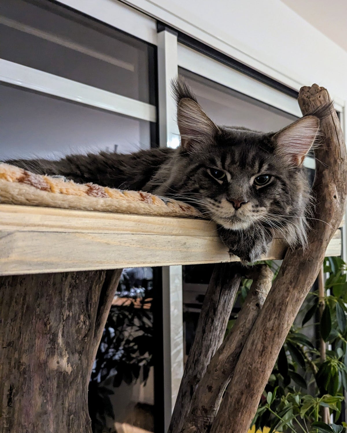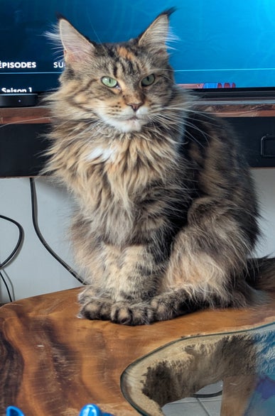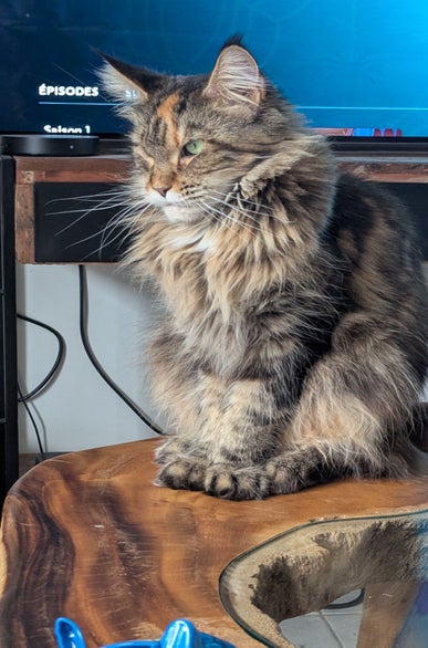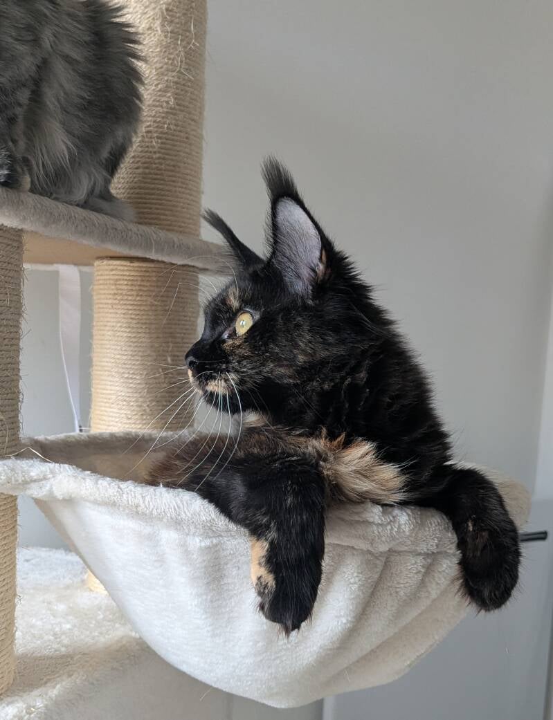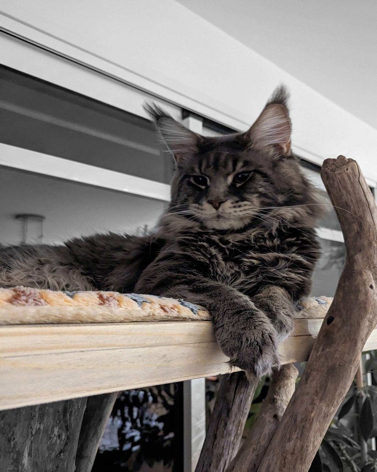 Un joli gabarit pour une femelle ! Plutôt solitaire, elle aime régner du haut de l'arbre à chat. Elle se comporte en reine et fait sa loi auprès de ses congénères. Elle se donne la priorité sur les genoux le soir sur le canapé et chasse qui veut prendre sa place d'un seul et petit avertissement. Elle est très respectée et se sent fier de son statut. c'est une calme mais avec du tempérament .