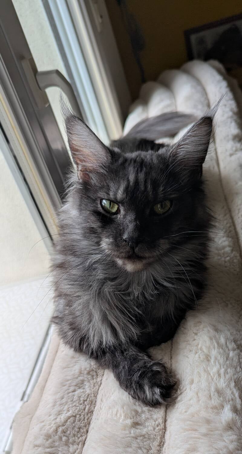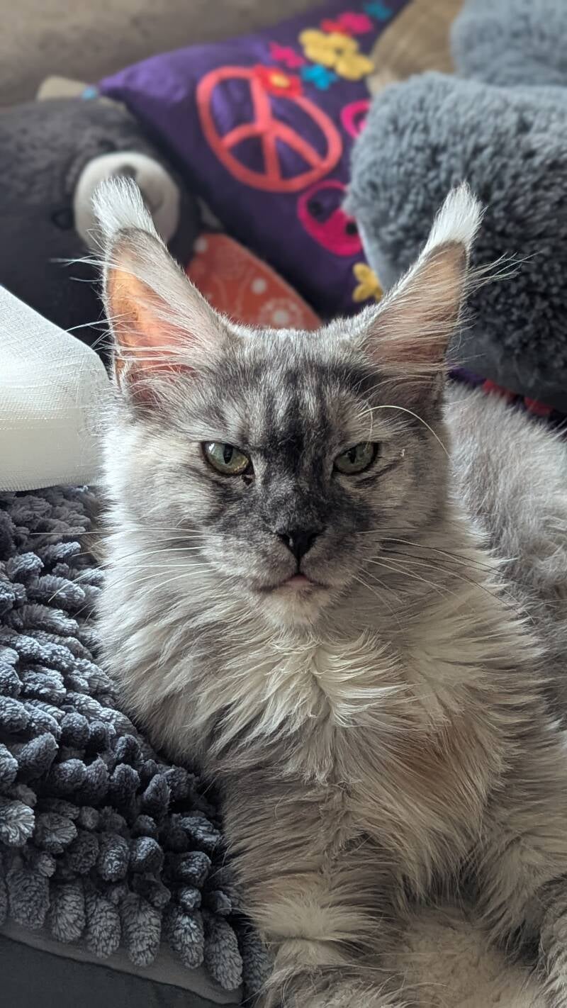 Grande avec de très longs tips et un beau profil, c'est une très bonne maman. Calme et douce, elle vit sa vie tranquillement. Elle aime beaucoup venir sur nos genoux sur le canapé pour avoir sa dose quotidienne de câlins. Elle s'entend bien avec tout les chats petits et grands. Elle est sans histoire. C'est un amour !